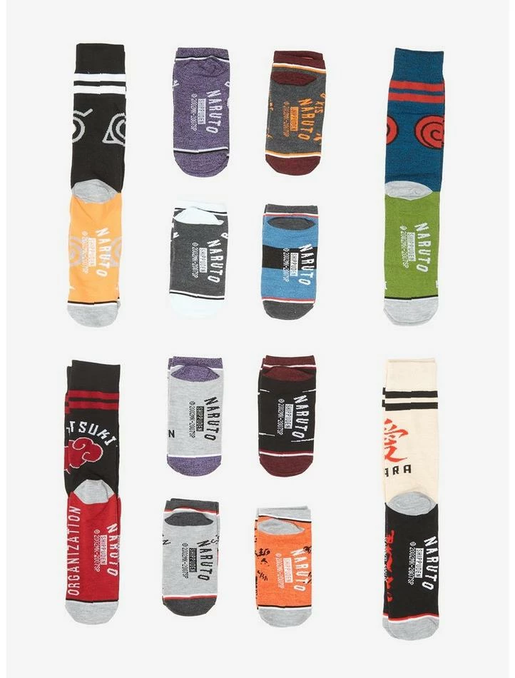 Increase your ninja stealth by ditching the shoes and wearing socks instead! This 12 pack from Naruto Shippuden features 4 pairs of knee-highs and 8 pairs of no-shows, all inspired by the anime.