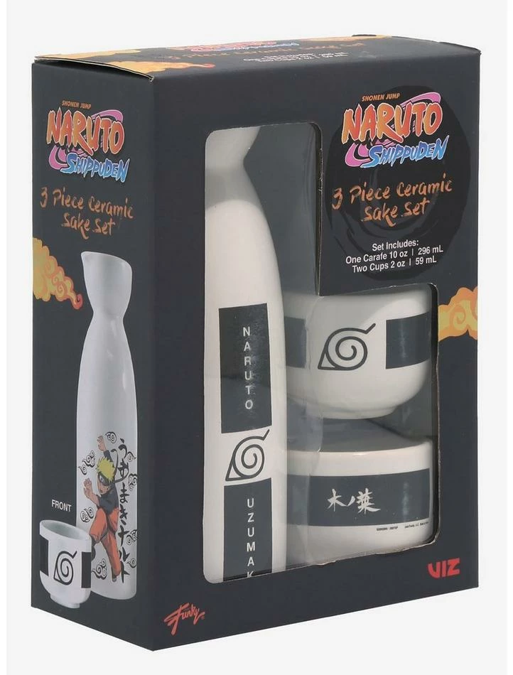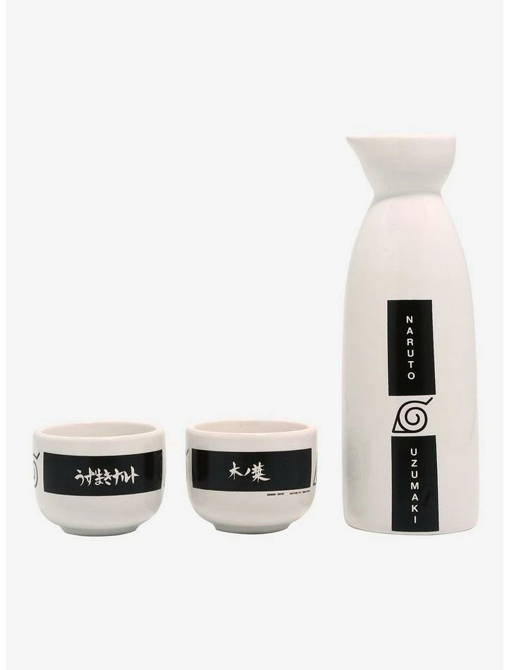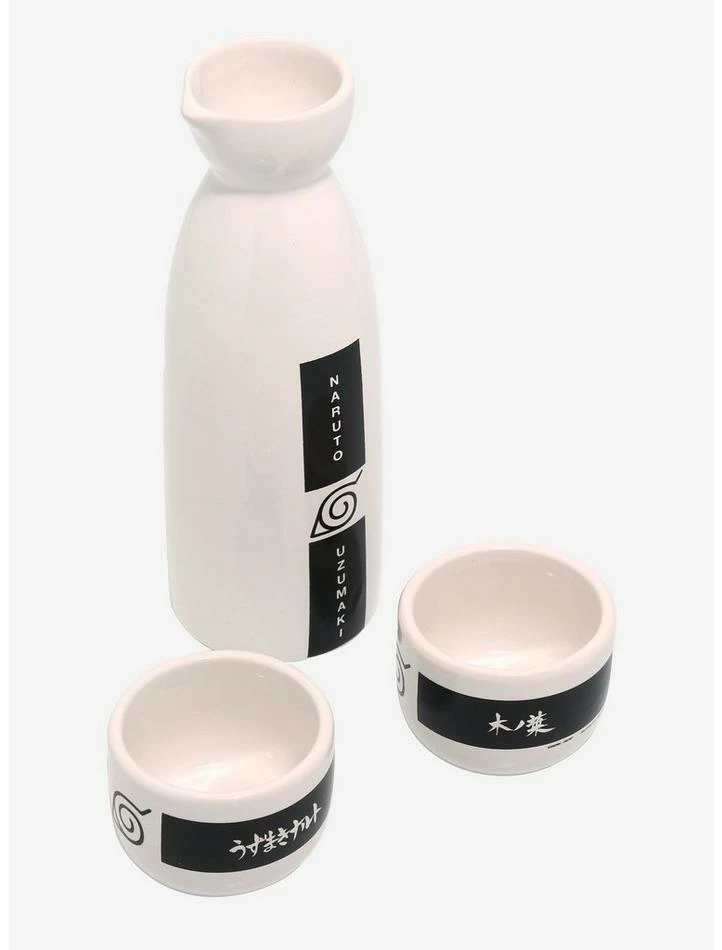 What goes well with Ichiraku ramen? Sake! Enjoy your next cold or hot beverage with this Naruto-inspired ceramic sake set. It has a carafe and two sake cups, all decorated with symbols from the anime.