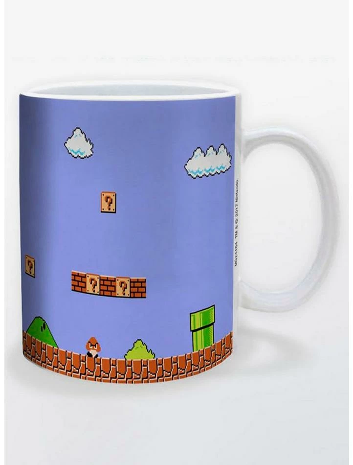 Give every morning a 1-up with this 11 ounce dishwasher and microwave safe ceramic mug. It features a classic Super Mario screen with question blocks, warp pipes, a goomba and more!