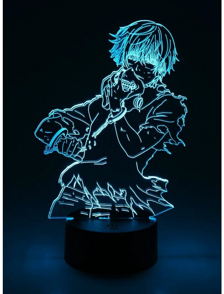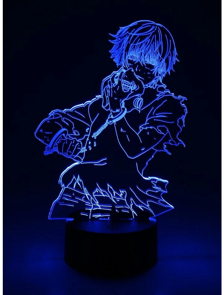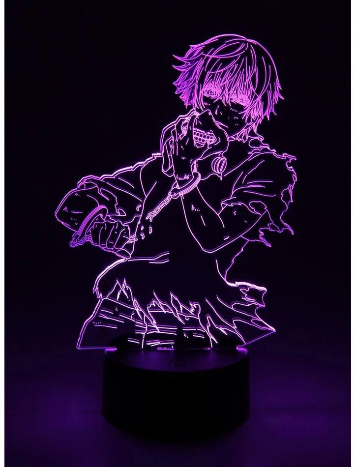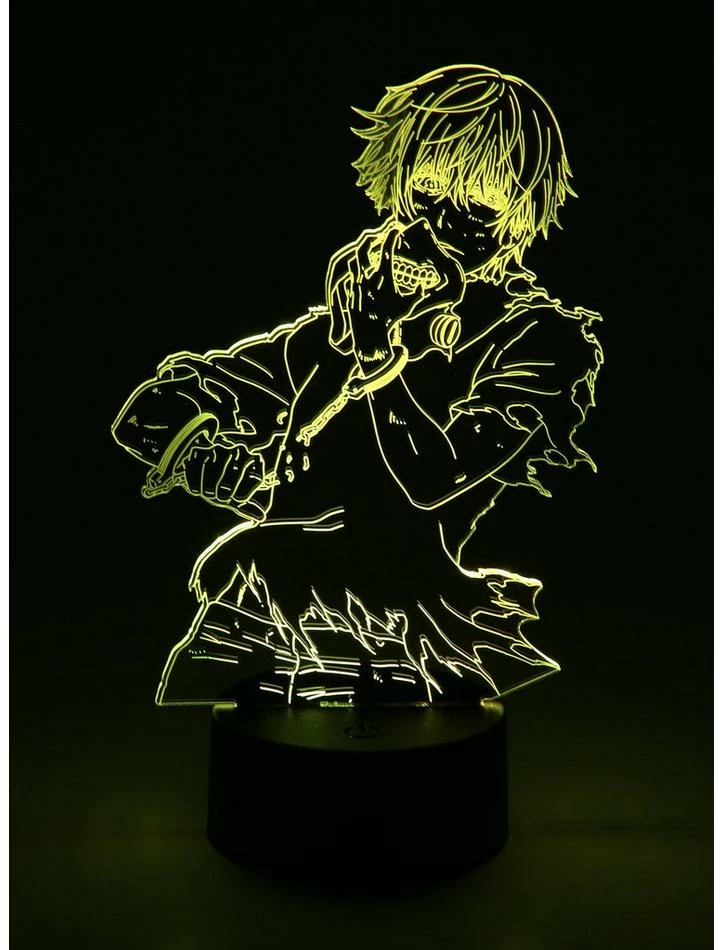 Give your space a ghoulish ambiance with this Tokyo Ghoul LED lamp, depicting Ken Kaneki holding his mask. This acrylic lamp comes with a black base and a controller that allows you to change the LED lights to any of the 16 available colors, as well as adjust to flash, strobe, fade and smooth modes.