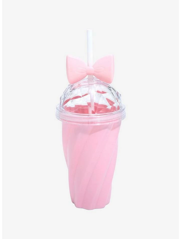 Stay hydrated in style with this pink travel cup featuring a dome lid and bow accent. Screw-on lid and reusable straw.