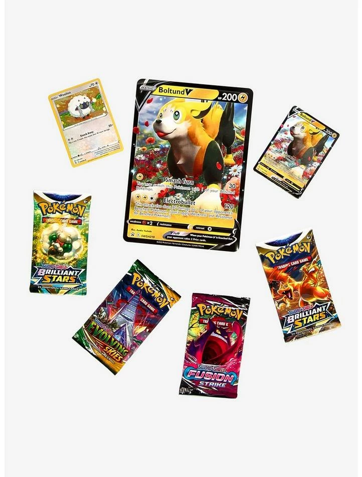 By channeling electricity into its legs, Boltund V can run nonstop for three full days! Using versatile moves, this quick PokΓ©mon has the speed you need to unleash electrifying combos in your next PokΓ©mon TCG match! In addition to Boltund V in both playable and display sizes, youβll find a foil promo card featuring Wooloo to keep Boltund company, plus extra treasures in PokΓ©mon TCG booster packs.