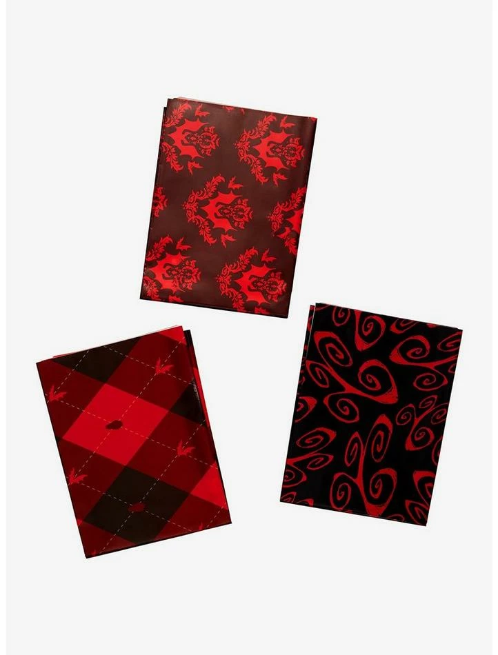 Level up your wrapping game with these sheets of paper featuring red and black designs with filigree, swirl and bat detailing.ย