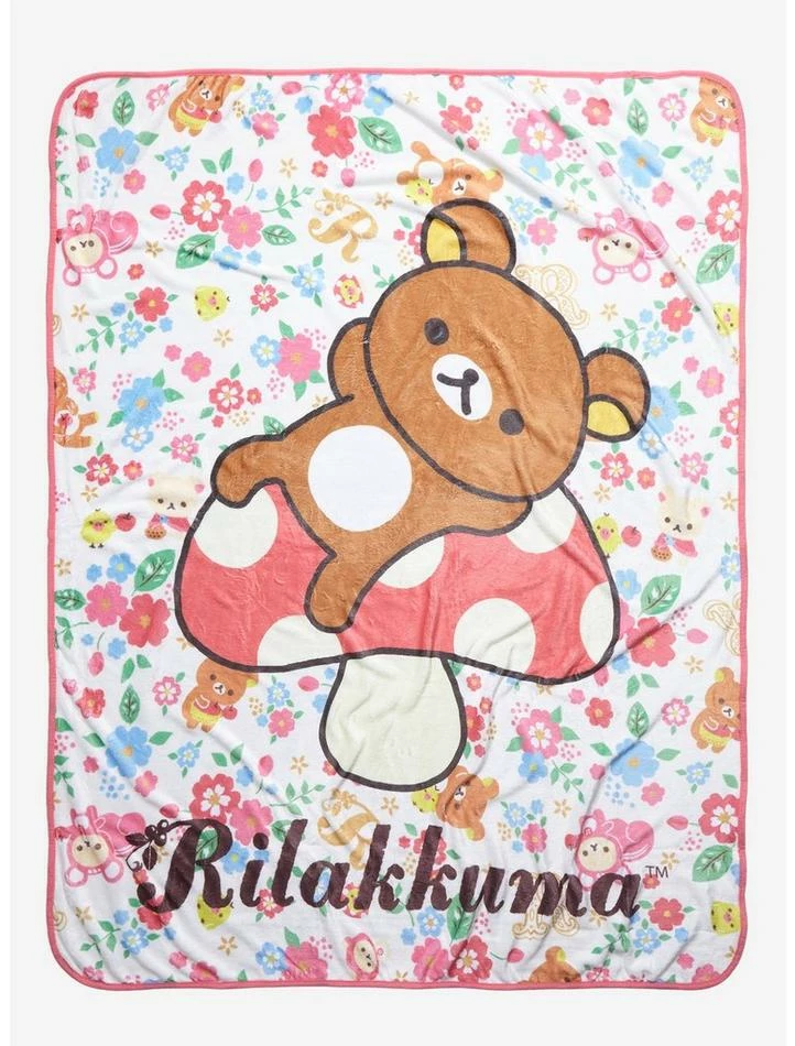 Had a long day? Time to cuddle up with the cutest teddy bear around! This soft throw blanket features an adorable toss of flowers plus Rilakkuma, Korilakkuma and Kiiroitori in different costumes and poses. Rilakkuma is also depicted front and center, lounging on a mushroom!