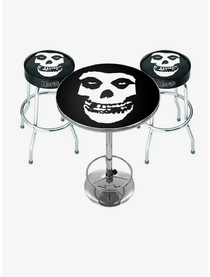 These unique sets are equipped with two licensed bar stools and a high-top table. The stools feature iconic Misfits fiend skull, a seat swivel top and chrome plated legs for a modern look.