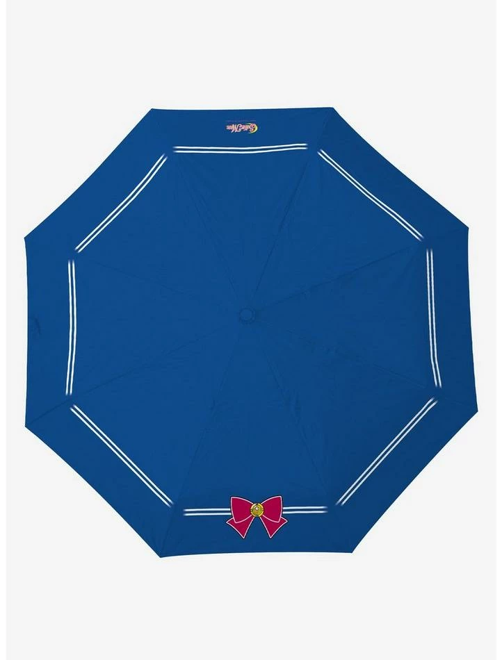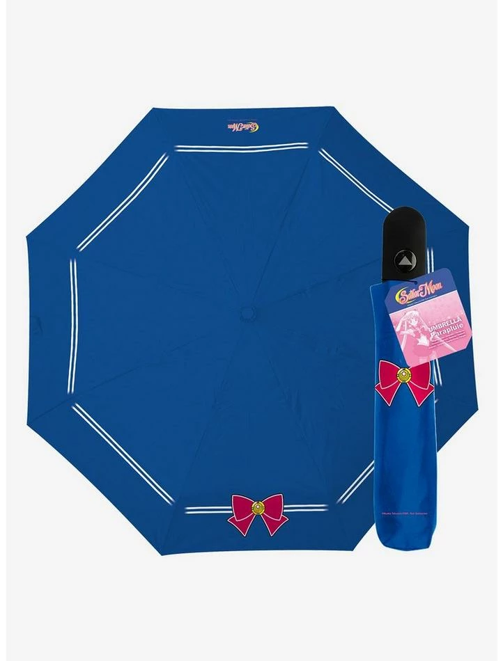 Officially licensed Sailor Moon umbrella. Features Sailor Moon’s classic bow with pin stripes on a blue background. Semi automatic umbrella with wrist strap and matching carrying pouch. Perfect for keeping in the car, in the office, or for taking on the go.