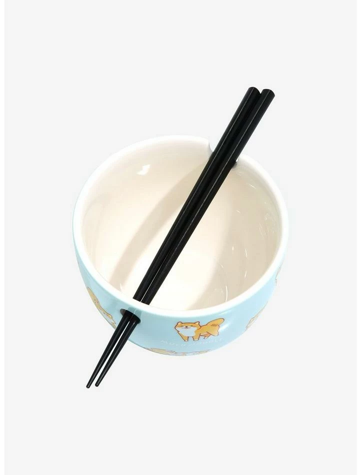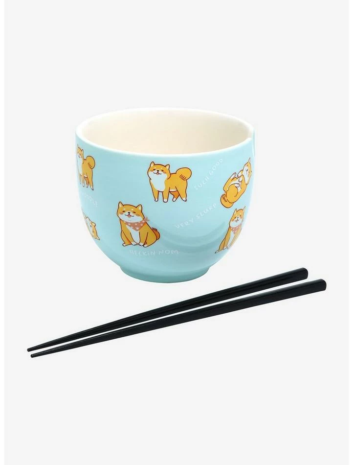 Had a ruff day? Relax with some ramen, and in the cutest bowl! This light blue bowl has adorable, playful Shiba Inus all over, with phrases like “Much noodle” and “Very slurp” throughout. Comes with a pair of chopsticks, plus a notch and hole on the bowl to set them on.