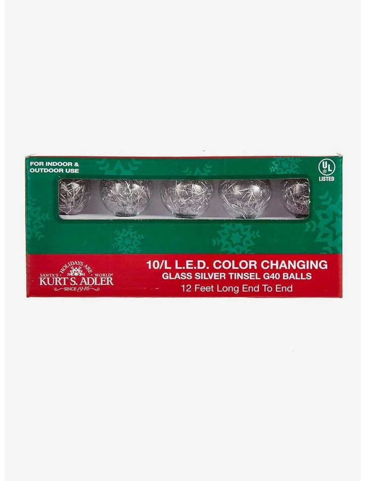 This Kurt Adler silver tinsel balls LED light set is a unique, festive way to add to the lighting of your holiday decor. Each light in this set has a beautiful round tinsel-adorned design that change colors. Features beautiful, round tinsel-adorned G40 bulbs with color changing including red, green, blue, and purple.