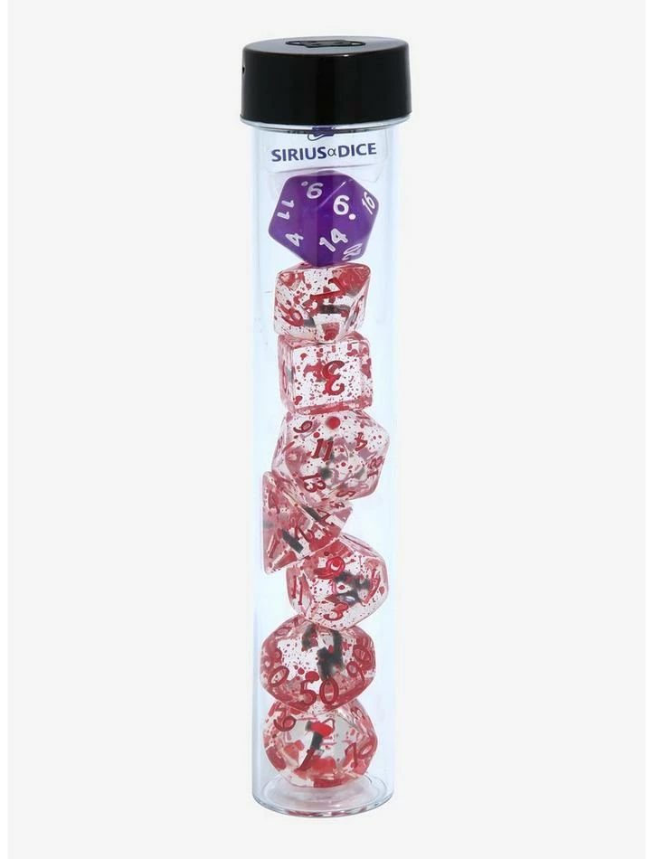 Playing a horror-themed campaign? Then you’ll want to make sure your dice fit the mood! This dice set features 7 bloody dice with knives in the center, plus an extra purple d20.