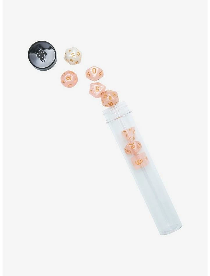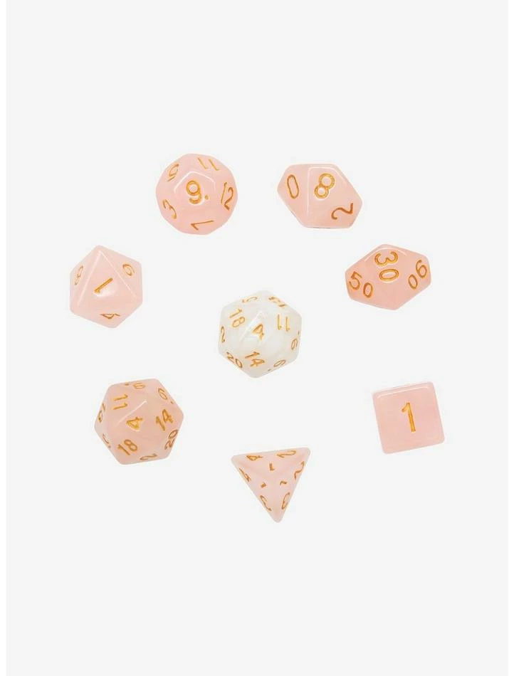 Your campaign will definitely be rosy with this dice set! From Sirius Dice, this set features rose quartz tone dice with gold numbers and an extra opalescent d20.