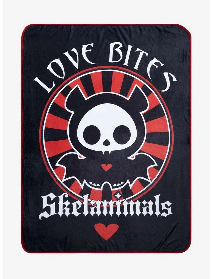 Unlucky in love? Your Skelanimals bestie is here to make you feel better! When you feel the need to wallow, cuddle up under this throw blanket, featuring Diego posing in front of a black and red striped design, plus the Skelanimals logo and “Love bites” above.