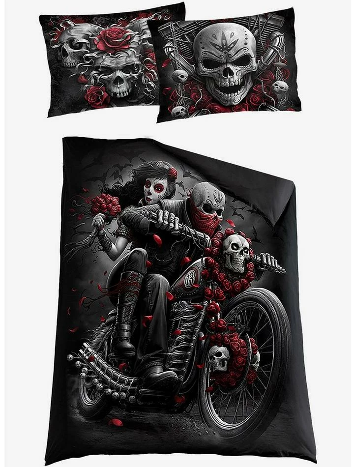 80s rock iconography given a modern twist. Rebellion exemplified, this classic pairing of skulls and roses is perfect for that next heavy metal concert? if you?ve got the appetite. Includes one duvet cover and two pillow cases. Fits a Single size bed and Standard size pillows.ย