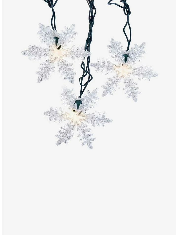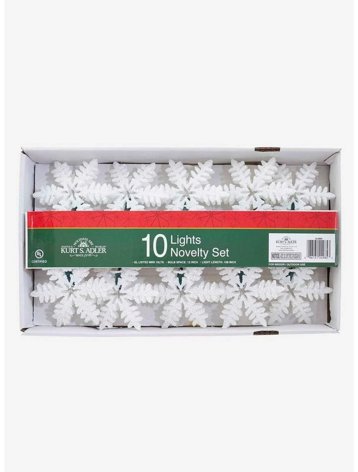Add to the lighting of your holiday or winter party decor with this 10-light white snowflake light set by Kurt Adler! Each of the 10 light covers in this novelty light set features a beautiful shimmering, textured white snowflake design that is sure to bring a wintry touch to your decor. Each set has a 36″ lead wire, 12″ lamp holder spacing, and clear UL-approved bulbs. For both indoor and outdoor use.