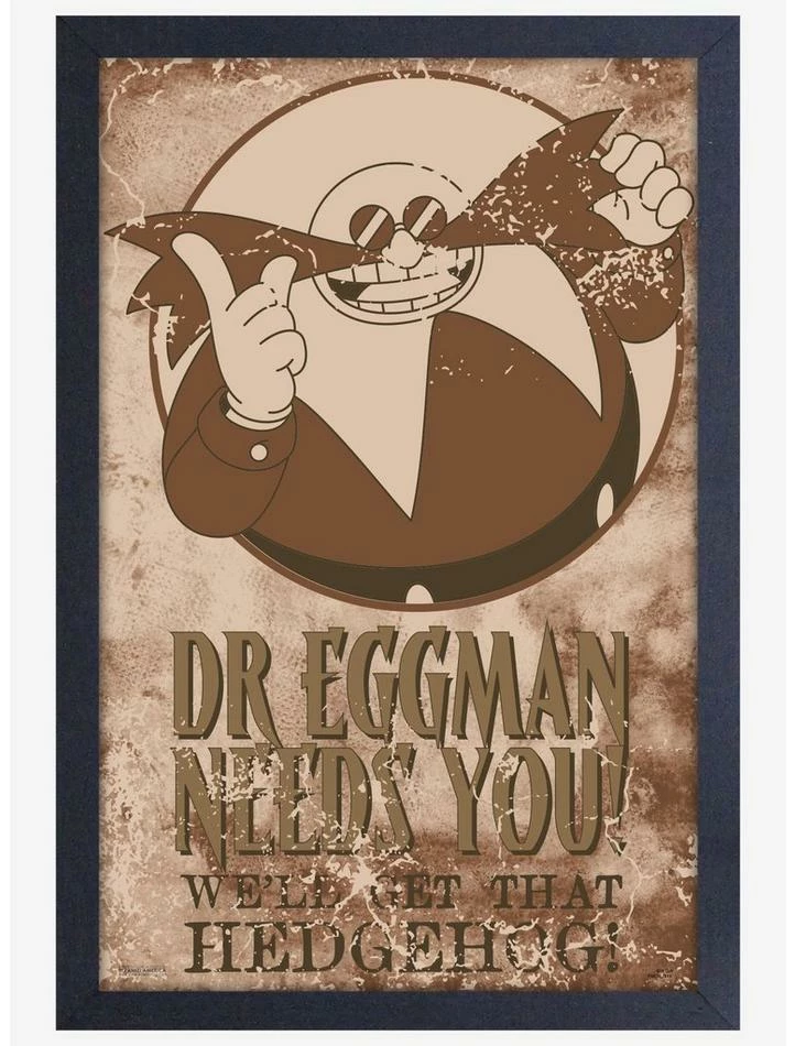 Bring your Sonic the Hedgehog fandom to any room in the house with this high quality framed Doctor Eggman poster print! Premium 11″ x 17″ print is framed to 13″ x 19″ and coated with a protective clear gel, which not only makes it super durable – it gives it that “movie screen” texture, too. Instantly hang your new work of art – and remember Doctor Eggman needs you – for years to come!