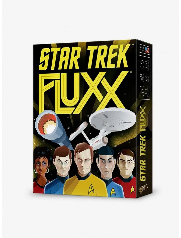 Set a course for the final frontier with Star Trek Fluxx! Featuring Kirk, Spock, McCoy, and the rest of the original series crew, you?ll take command of the Enterprise, and face Creepers like Klingons, Romulans, and the terrifying Doomsday Machine. You might even find yourself playing Fizzbin or Venting the Warp Core to explore new worlds and collect the Keepers needed for victory! Star Trek Fluxx will take you where no card game has gone before!