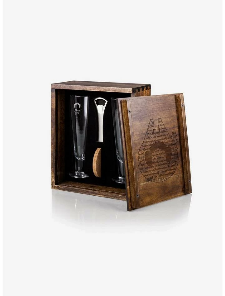 The handsome acacia wood, dovetail joinery, and delicate engraving of the Han and Leia Beverage Glass Set can stand alone on your bartop as a Star Wars-themed objet d’art with engraved Millenium Falcon. But under the sliding, removable panel there are two tall 12 oz Han and Leia fluted beverage glasses, two real cork beverage coasters, and a deluxe bottle opener. This beverage set brings back the ceremony of serving drinks and is the ideal Star Wars gift.