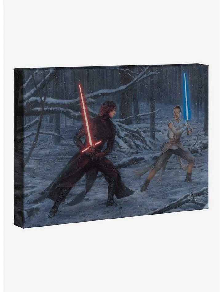 After fleeing Starkiller Base, light side heroes, Rey and Finn are confronted by dark side enforcer Kylo Ren. After Han’s conflict with his son, Kylo Ren, Rey steps forward and tries to shoot Ren who uses his Force powers to launch her into a tree. An angry Finn powers up Luke Skywalker’s Lightsaber and attempts to defend Rey only to be incapacitated by Kylo Ren, left lying unconscious in the snow. Kylo Ren is shocked when Skywalker’s Lightsaber flies by him into Rey’s hand. He senses her connection to the Force but is confident that he is the more powerful one. When he complements her and offers to train her these words awaken Rey’s own power. The Duel Rey vs. Ren by Thomas Kinkade Studios.