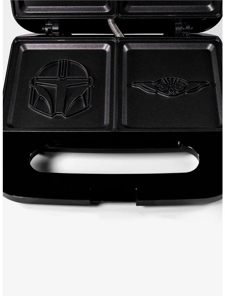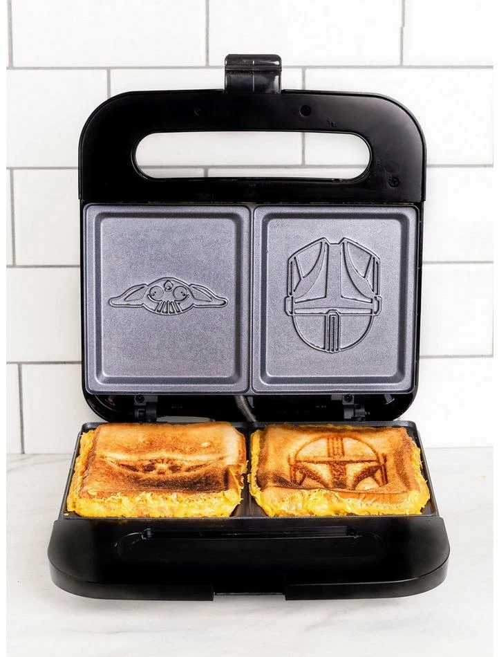 Grilled Cheese just got special. This Mandlorian sandwich press puts a silhouette of Grogu or Mondo on both sides of your pressed grilled cheese sandwich. Also use it to make square waffles french toast brownies and even omelettes. This grilled cheese maker not only makes two servings at once its compact size is perfect for small countertops. The durable plates give you the best grilling in the galaxy and will put a silhouette of Mondo or a Baby Yoda on both sides of your pressed sandwich. Inner plates are durable easy to clean and reduce the need for butter and oil. The Mandalorian & Grogo sandwiches are the perfect way to bring pop culture cheer to any hero’s kitchen. UL listed. Designed for 120v systems in the US Canada and Mexico.