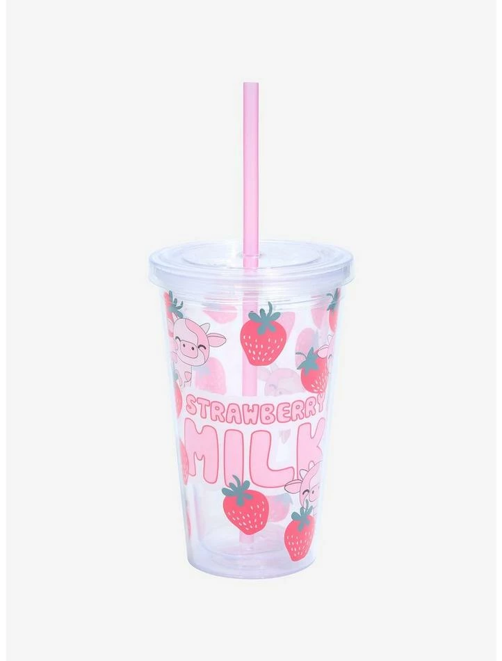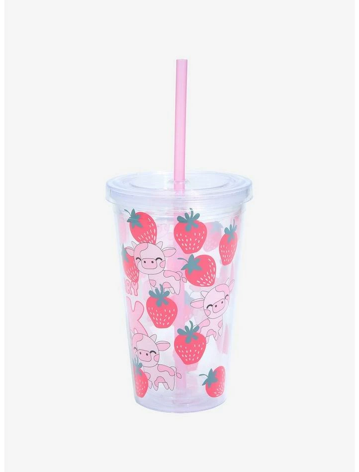 We’ve got something sweet for you to hold your delicious strawberry milk! This acrylic travel cup features an allover toss of pink cows and strawberries, with “Strawberry Milk” printed at the center. Comes with a screw-on lid and a reusable straw.
