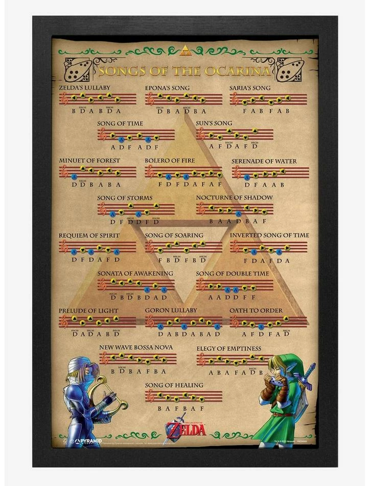 Β Do you have a favorite song of the Ocarina? Display them all on this poster from The Legend of Zelda! It is framed and ready to be displayed in your castle. Celebrate your fandom with this framed print!Β