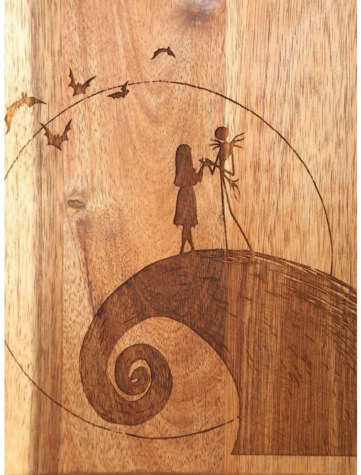 Serve the finest meats and cheeses to your spooky friends with this wooden serving plank from The Nightmare Before Christmas. “Now and forever” verbiage is etched into the wood along with Jack and Sally standing on the hill in front of the moon.