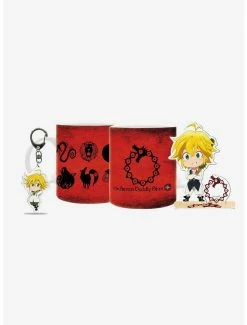 Officially licensed The Seven Deadly Sins merchandise. Assortment includes (1) Emblems Mug, (1) Meliodas Acrylic Keychain, and (1) Ban Acryl. Mug holds 11 oz. and is dishwasher and microwave safe. Keychain includes a convenient clip that makes it easy to attach to your keys, bag or backpack. Acryl figure includes (1) Ban figure, (1) base, and (1) charm.