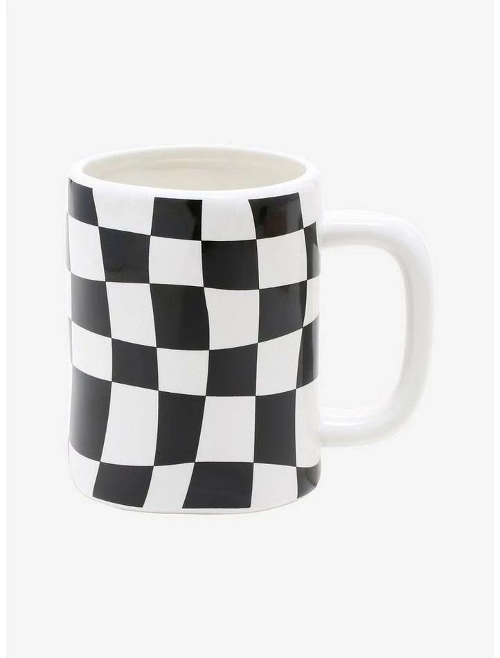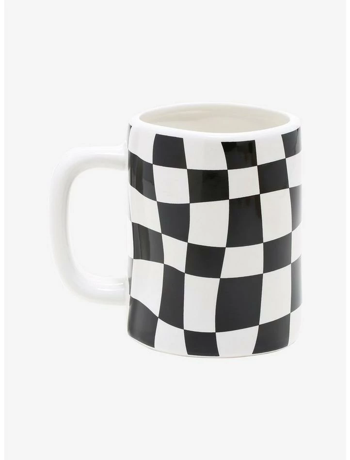 Keep your caffeine in check with this white mug featuring a black wavy checkered pattern.