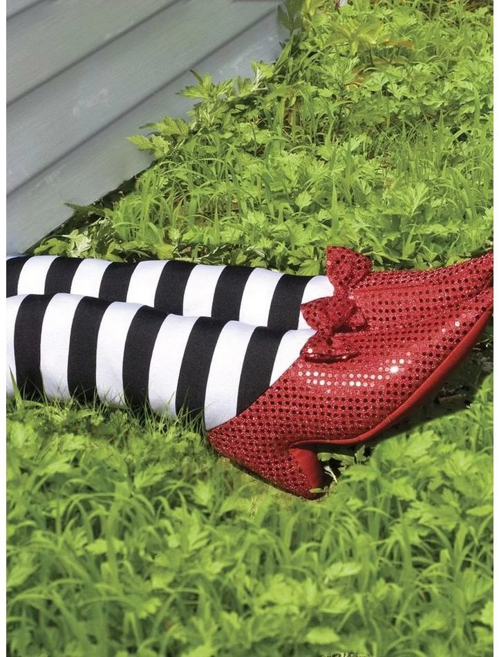 Sure to become Toto’s favorite tinkle spot. Our Wicked Witch Legs Decoration is perfect for Halloween and movie buffs alike, each set made to look like a pair of legs wearing black and white stockings under their ruby slippers. Great for garage doors, on the sides of houses, and under cars.
